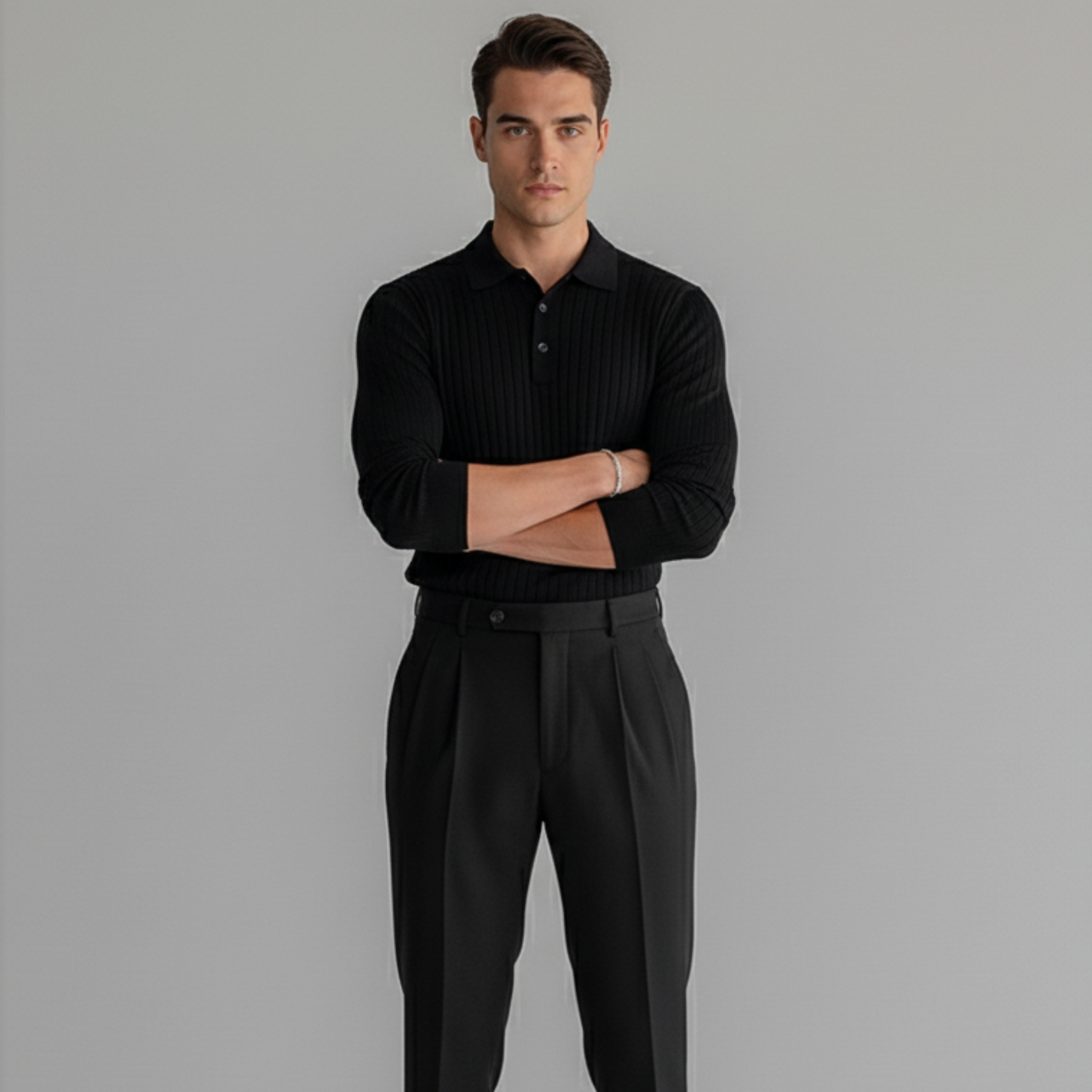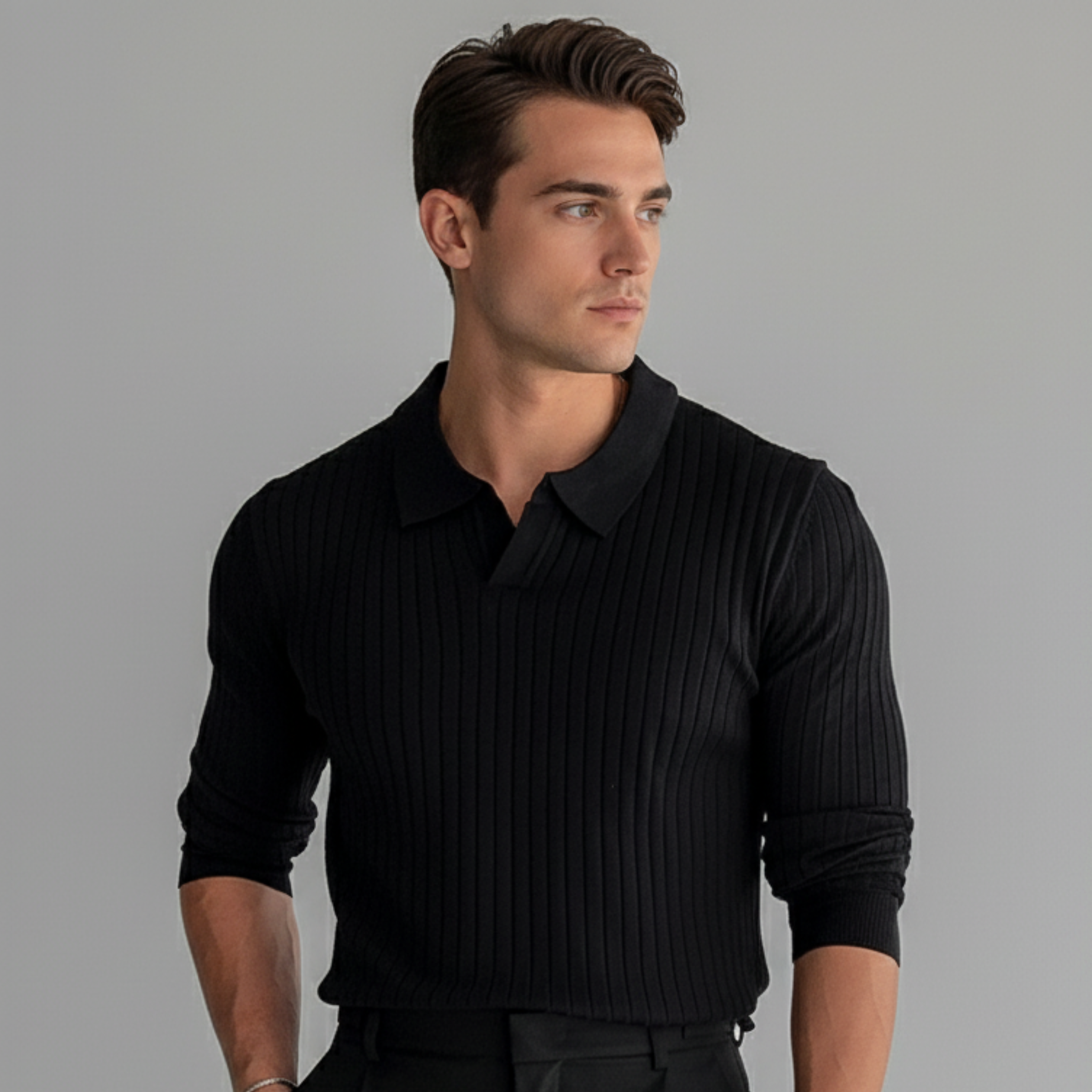 חולצת סריג פולו Verona אלגנטית בשרוול ארוך, עם מרקם פסים אנכיים דקים שיוצרים קווים מחמיאים ומראה נקי ומוקפד. הצווארון הקלאסי מוסיף טאץ’ של יוקרה נצחית, ונותן לפריט אופי של Old Money אמיתי, כזה שכל גבר צריך במלתחה שלו.